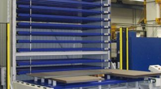 Die Ein- und Auslagerung von Paketen in das Lager übernimmt ein Regalbediengerät (RBG). Erfordert ein Versandauftrag die Kommissionierung verschiedener Einzelplatten, stellt ein Manipulator mit Vakuumhebern die entsprechenden Artikel zusammen, wobei mehrere Aufträge parallel abgearbeitet werden können. Somit stellen zwei getrennte Systeme auf engstem Raum hocheffizient die Aufträge zusammen.