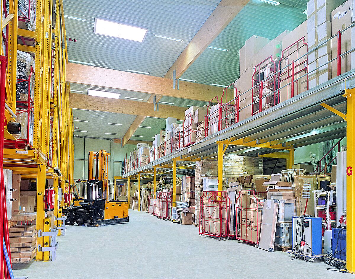 - Robuste Kombination aus Regalsystemen und Zwischengeschoss