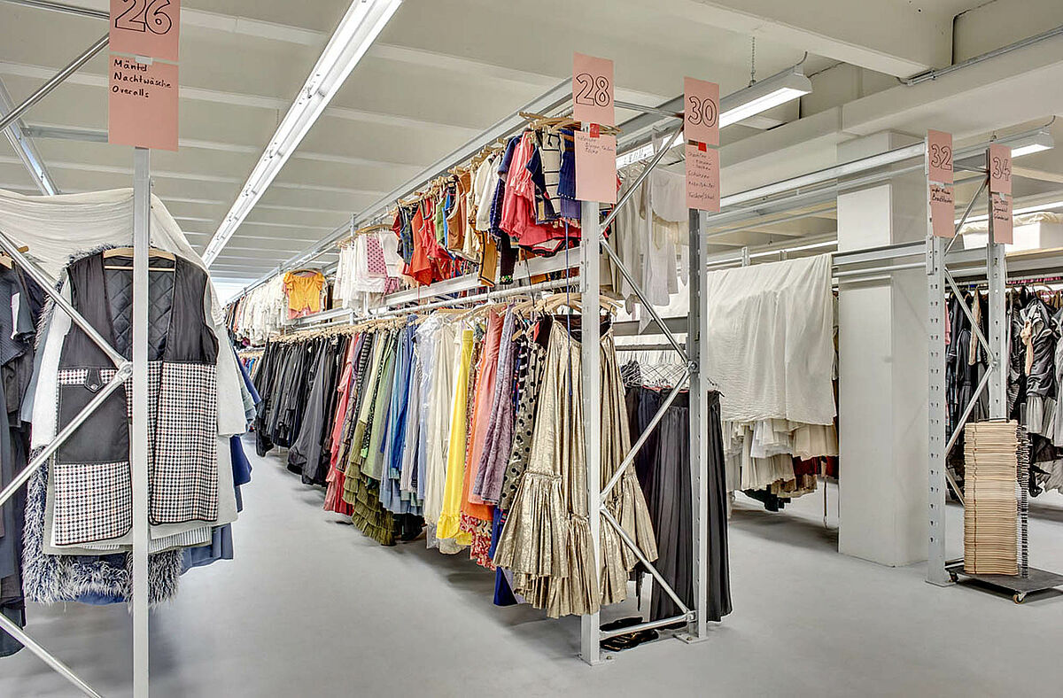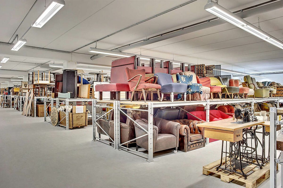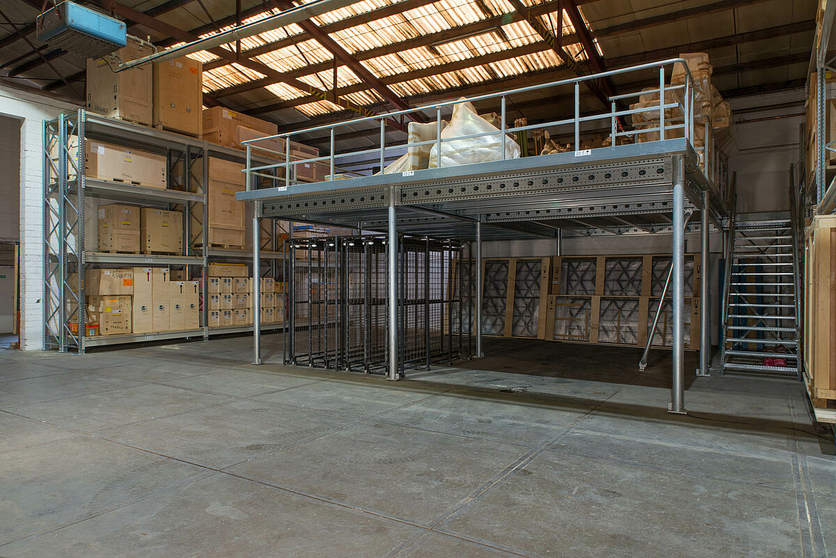 Durch den Einbau von robusten Lagerbühnen kann in mehreren Stockwerken gelagert werden. Somit können Requisiten wie z.B. Möbel, Lampen oder Dekorationen sowie Kostüme platzsparend und übersichtlich untergebracht werden.