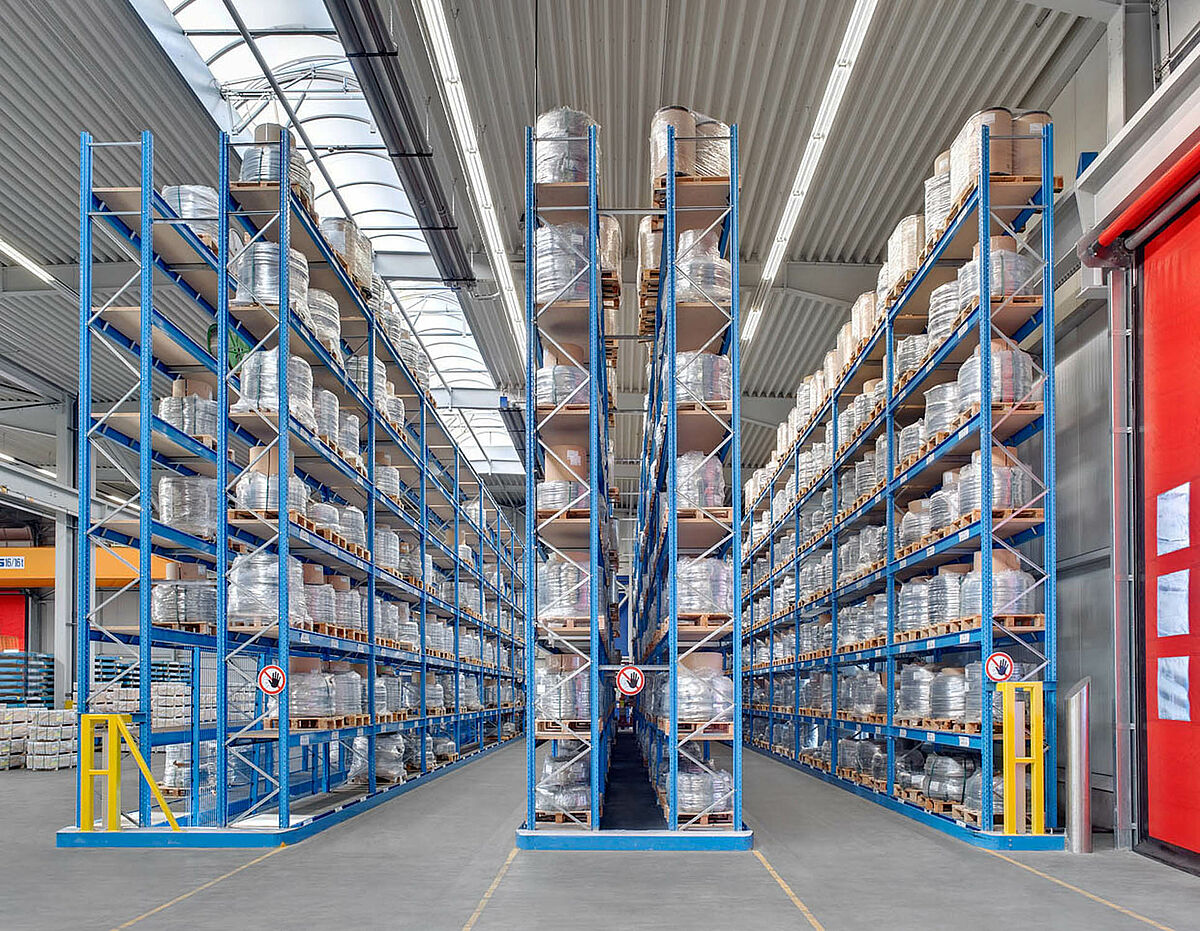 Führungsschienen an den Regalfüßen und Einsatz von Hubtex-Vierwege-Staplern ermöglichten eine Gangbreite von lediglich 2,42 m, welche wiederum durch ein Gangsicherungssystem abgesichert werden musste, um ein Zusammentreffen von Personen und Stapler in diesen Schmalgängen zu vermeiden.