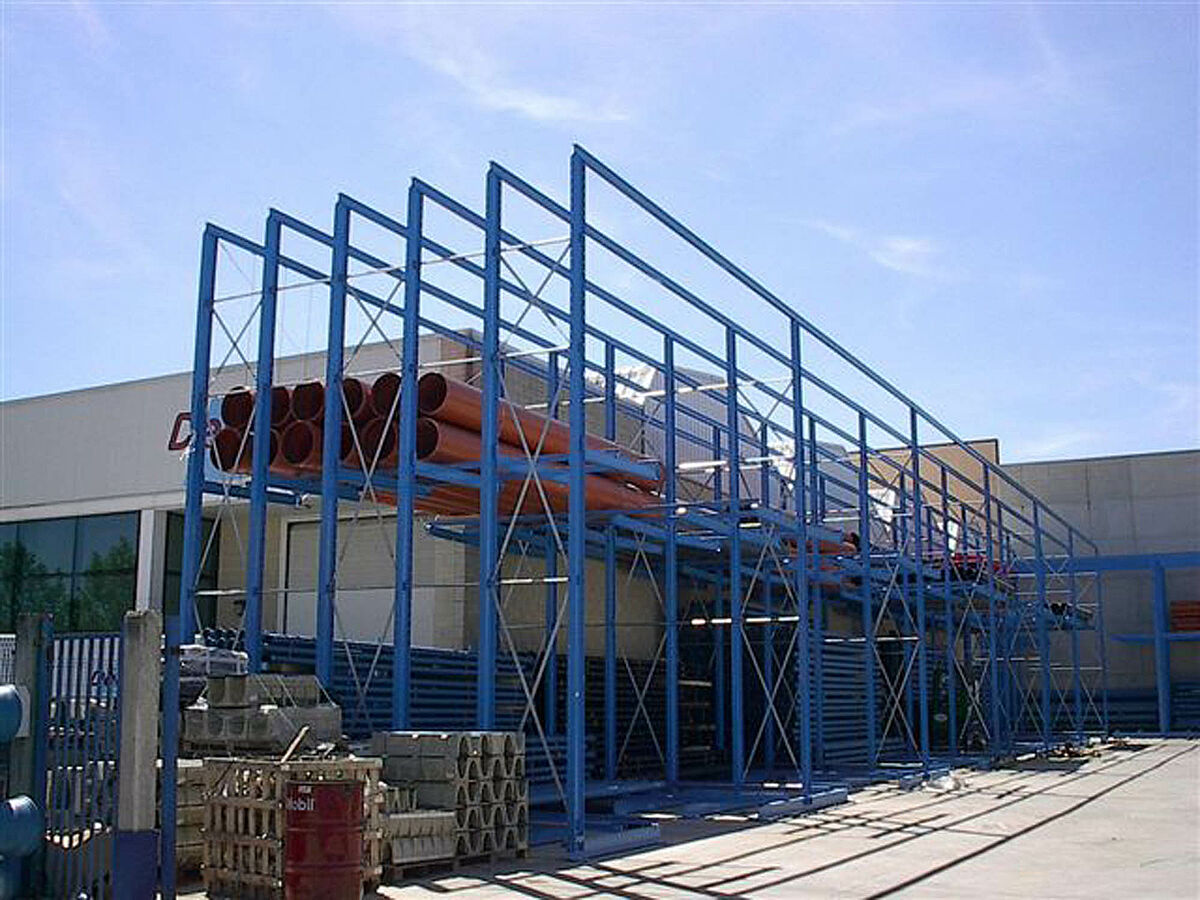 Als Ergänzung zum Einfahrregal lieferte und montierte OHRA zusätzlich robuste Kragarmregale. Hier werden die Sorten gelagert, die nicht so häufig benötigt werden. Die Rohrbündel lagern hier in mehreren Ebenen übereinander. Dank der Kragarmlängen von bis zu 2.500 mm kann der Kunde hier auch 2 Rohrpakete hintereinander auf einer Ebene lagern.